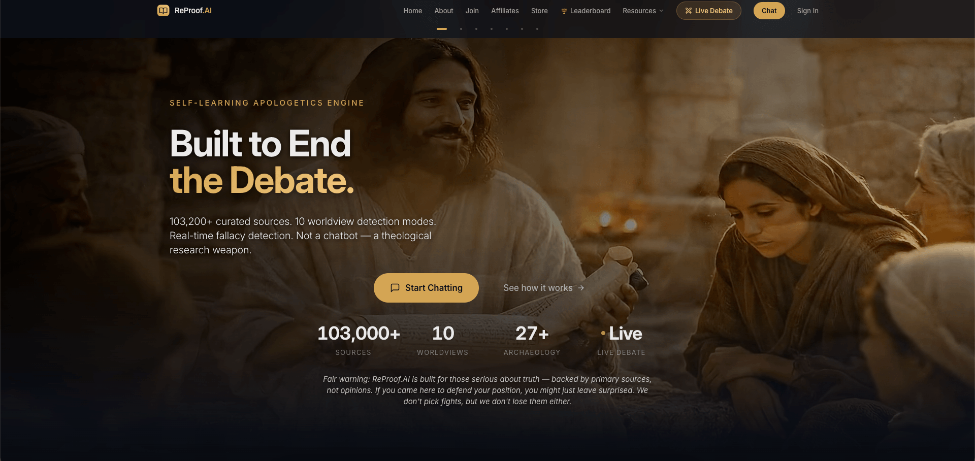ReProof.AI is a self-learning biblical apologetics engine designed for theological research and defense. It leverages a specialized engine named Enoch to provide evidence-based answers from a knowledge base of over 111,000 indexed primary sources, focusing on primary documentation rather than opinions.